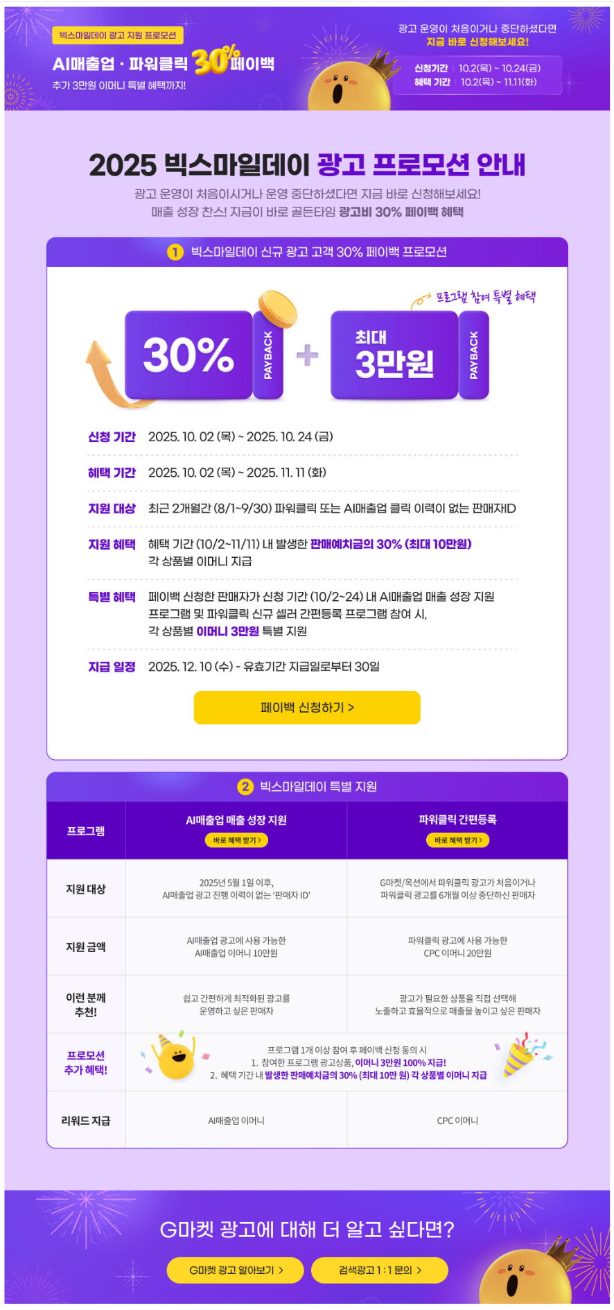 - 특별 혜택 : 페이백 신청한 판매자가 신청 기간 (10/2~24) 내 AI매출업 매출 성장 지원 프로그램 및 파워클릭 신규 셀러 간편등록 프로그램 참여시, 각 상품별 이머니 3만원 특별 지원